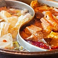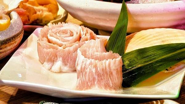 店家很講究的將松阪豬肉擺盤成美麗的玫瑰形狀,豬肉部分相較於牛肉吃起來更顯脆口,雖然涮鍋的時間稍長,仍保有彈性Q甜無腥味的口感。
