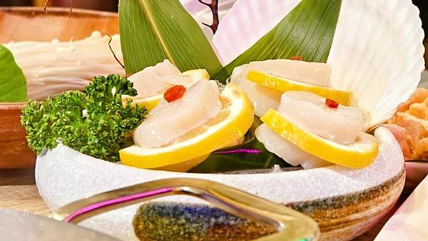 海鮮部分點了生食級干貝,很可愛的上面還加入枸杞和檸檬裝飾點綴,生食級干貝涮鍋約7秒,店家很貼心會提供小沙漏,雖然尺寸不大,但整體吃起來鮮甜且富有彈性,這種高品質新鮮程度一吃就知道。