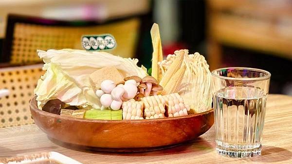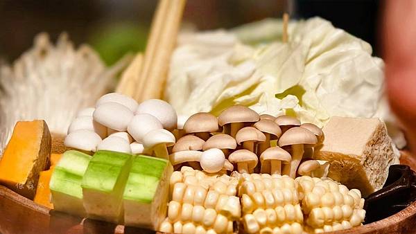 綜合菜盤內容豐富,有高麗菜、玉米、金針菇、南瓜、黑木耳、絲瓜、凍豆腐、香菇、玉米筍及豆腐紙,食材選用當季且外觀都有精挑細選過,看似淺淺一鍋卻菜量豐沛,讓享用這份鍋物的同時健康更多、負擔更少。